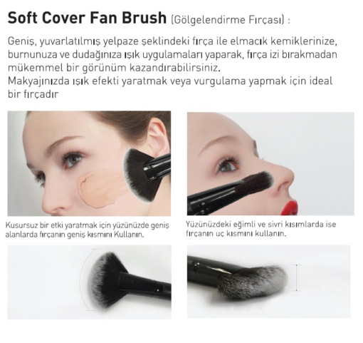 Geniş, yuvarlatılmış yelpaze şeklindeki fırça ile elmacık kemiklerinize, burnunuza ve dudağınıza ışık uygulamaları yaparak fırça izi bırakmadan mükemmel bir görünüm kazandırabilirsiniz.